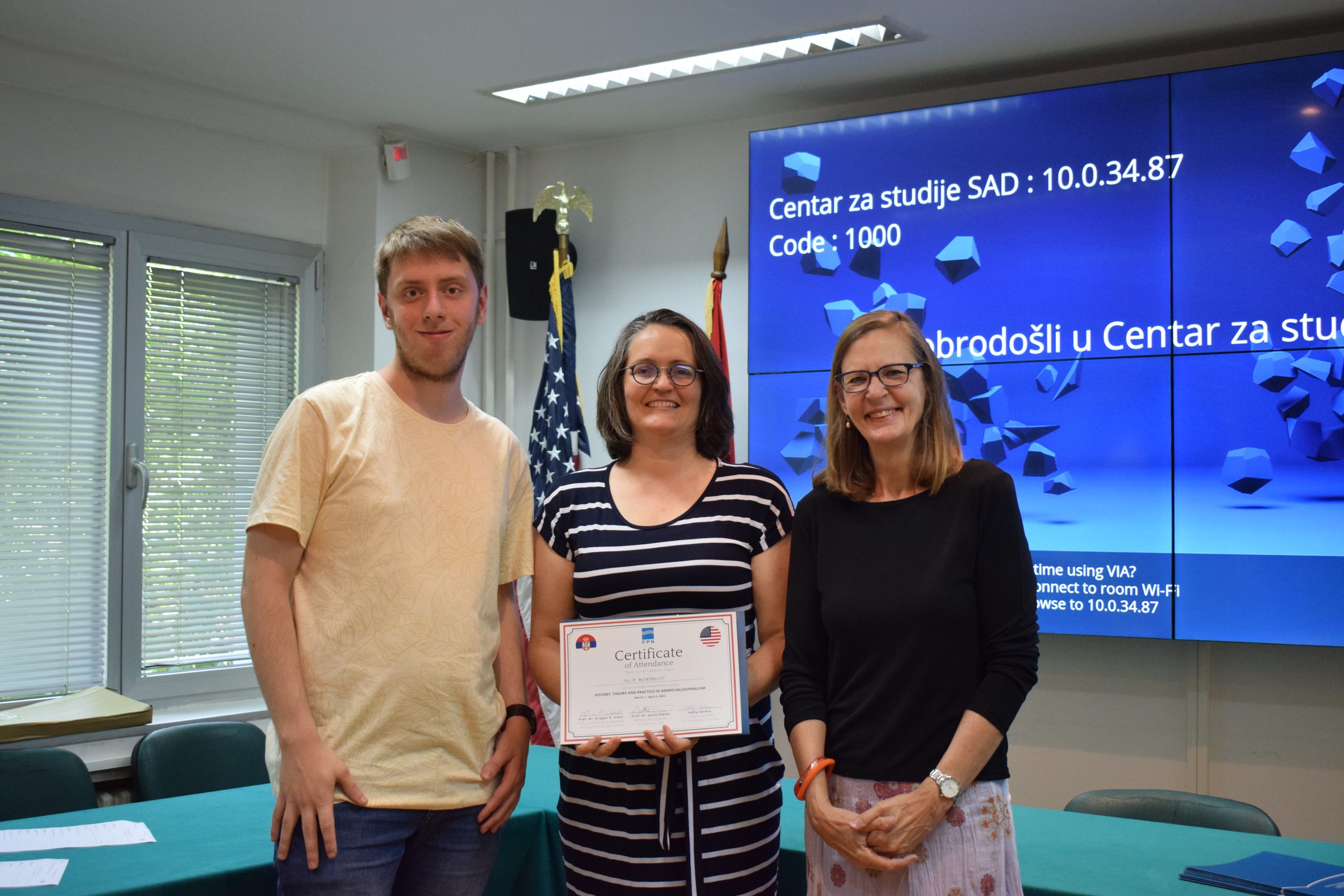 Свечана додела сертификата новинарских курсева ,,Историја, теорија, пракса америчког новинарства” и ,,Приповедачко новинарство”, које је држала проф. др Џенет Стил (Janet Steele) са Елиот школе међународних послова Џорџ Вашингтон Универзитета (Elliot School of International Affairs, George Washington University), одржана је на Факултету политичких наука. На свечаној додели сертификата присуствовали су декан Факултета политичких наука проф. др Драган Р. Симић и аташе за културу Амбасаде Сједињених Америчких Држава у Србији, Холи Зардус (Holly Zardus).