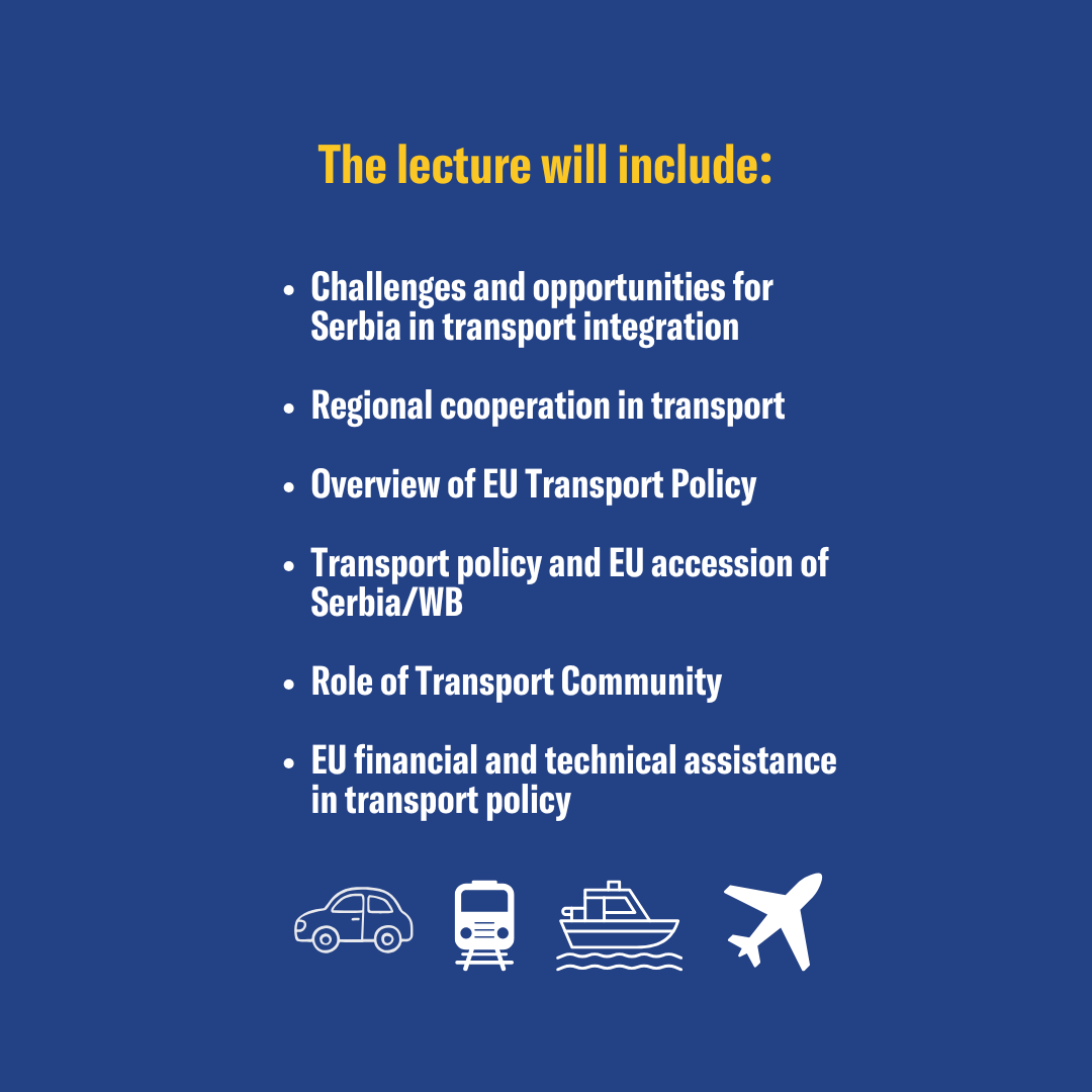 Гостујући предавач, директор Транспортне заједнице г. Матеј Закоњшек, говориће о феномену фазне или постепене европске интеграције на примеру транспортне политике ЕУ а неке од тема укључују: