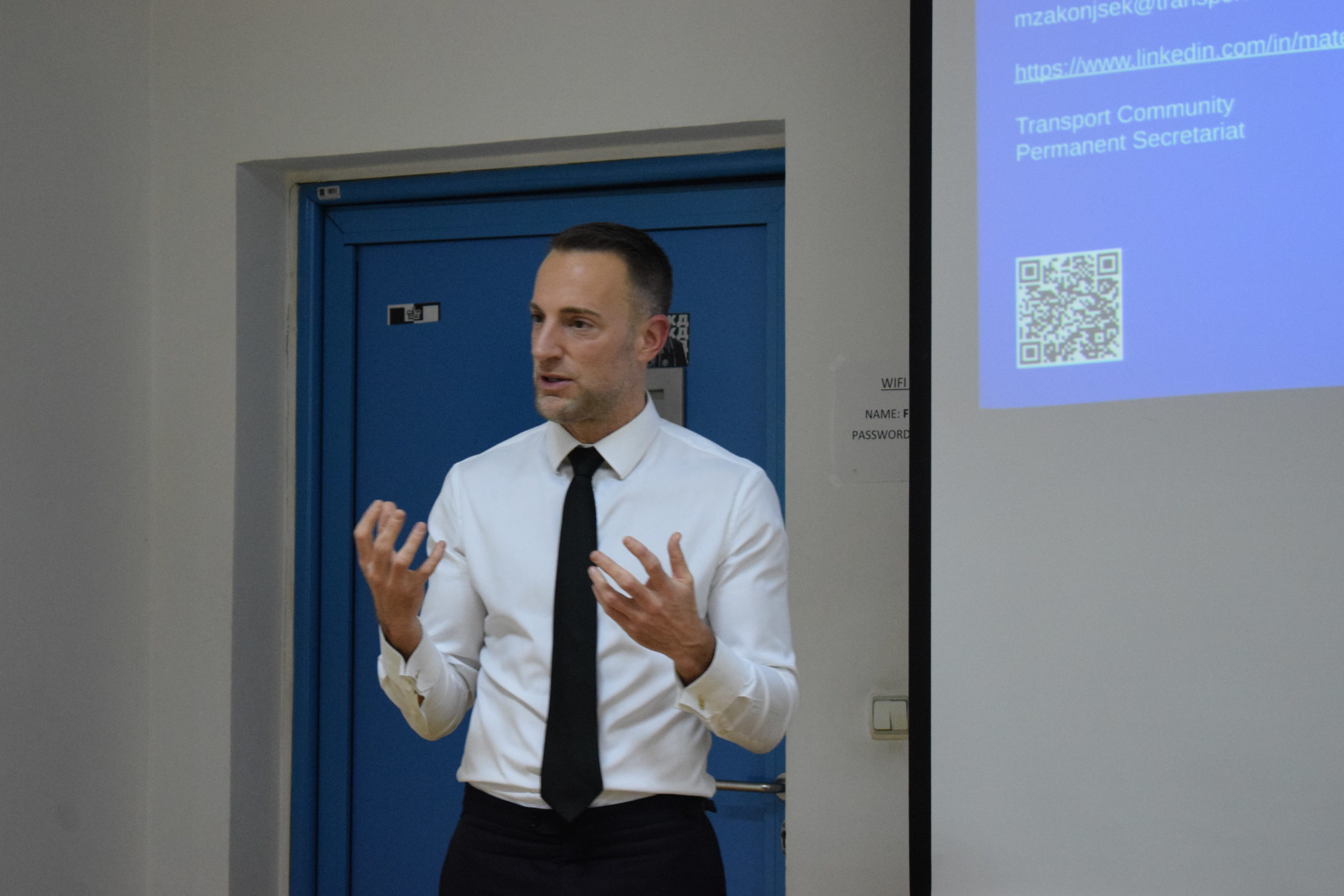 Матеј Закоњшек говорио је о феномену постепене европске интеграције на примеру транспорте политике Европске уније. Он се осврнуо на кључне изазове и развојне могућности Србије и региона у процесу транспортне интеграције. „Суштинска важност овог простора лежи у пресецању два кључна коридора на подручју Западног Балкана. Да би се дошло до комплетне интеграције у систем Европске уније, реформе и пројекти из ове области треба да буду усаглашени и да се спроводе заједно“, истакао је Закоњшек. Он је указао на то да би имплементација планираних пројеката довела до значајних напредака транспортне мреже Србије до 2030. године. Закључио је да је мисија Транспортне заједнице да цео регион има исте транспортне стандарде као и земље Европске уније.